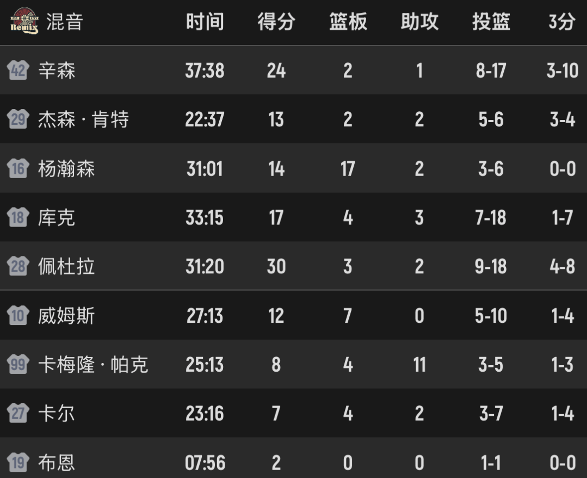 末节混音球员单打太多,杨瀚森没怎么发力,混音以127-111轻松取胜。杨瀚森本场出战31分钟,投篮6中3,罚球4中4,没有投三分,砍下14分17板2助2帽,其中前场板抢了6个。自从登陆NBA以来,在开拓者以及混音队,这是杨瀚森篮板球最多的一场。在一位懂得欣赏自己的主帅手下,杨瀚森一次又一次证明自己。