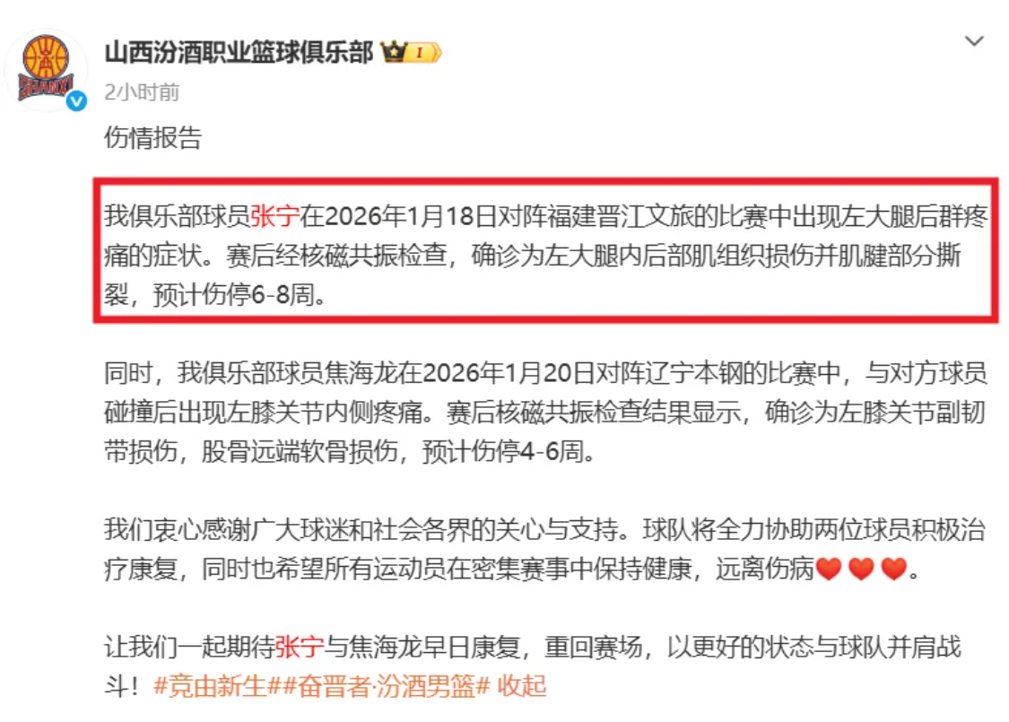 至少伤停6周!张宁严重拉伤,山西男篮官宣